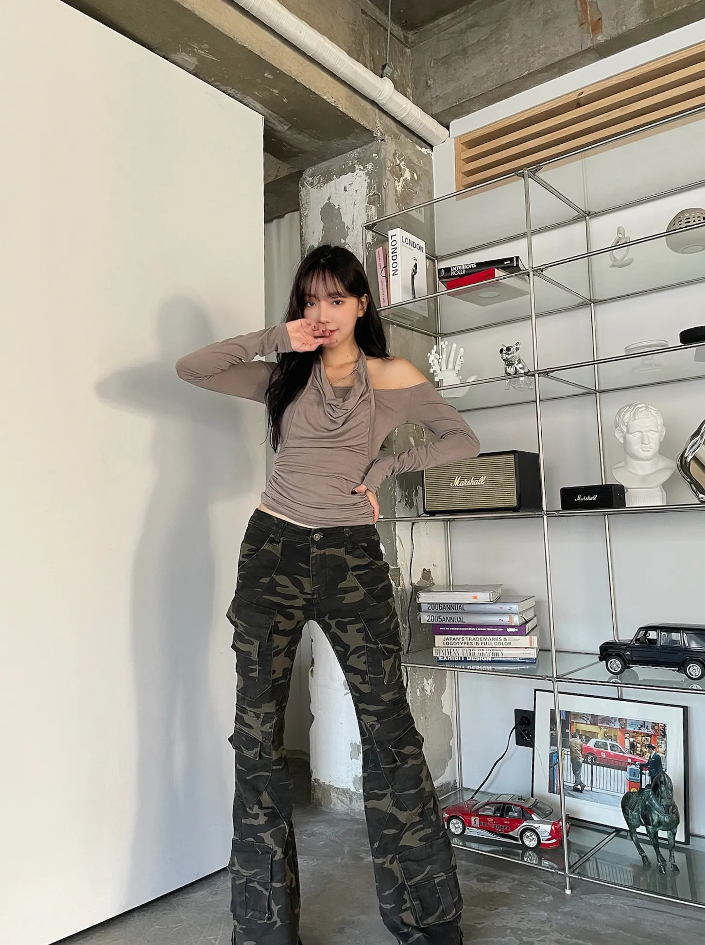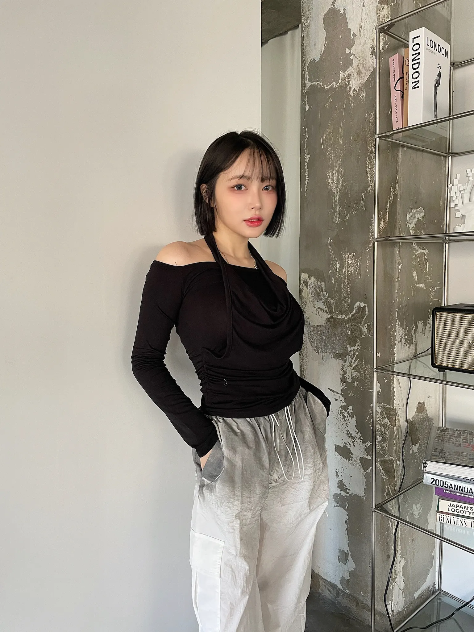 海西歐膩pick!!🇰🇷紅影流韻酷帥感繞脖垂領上衣(黑/杏咖)